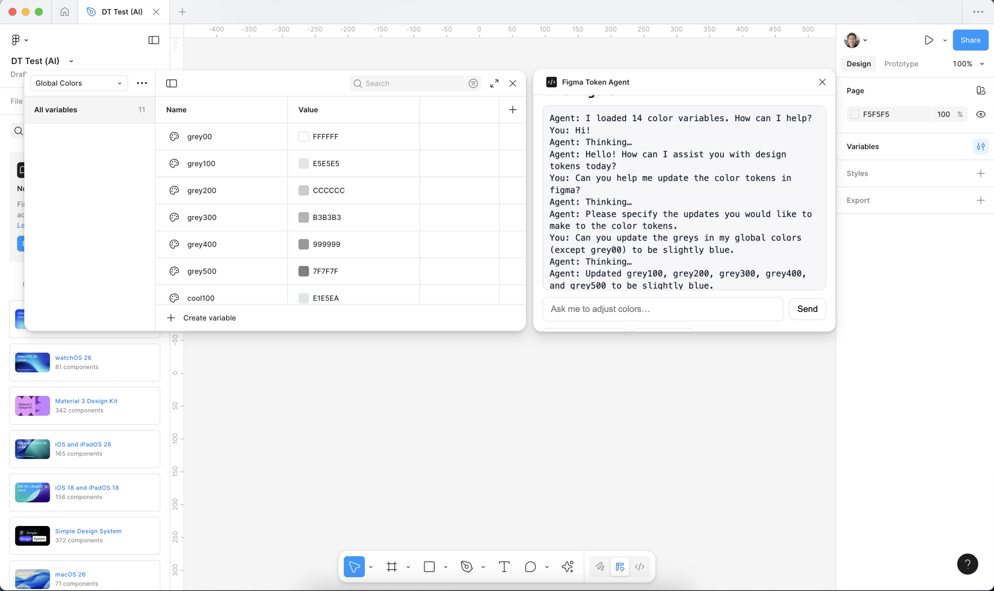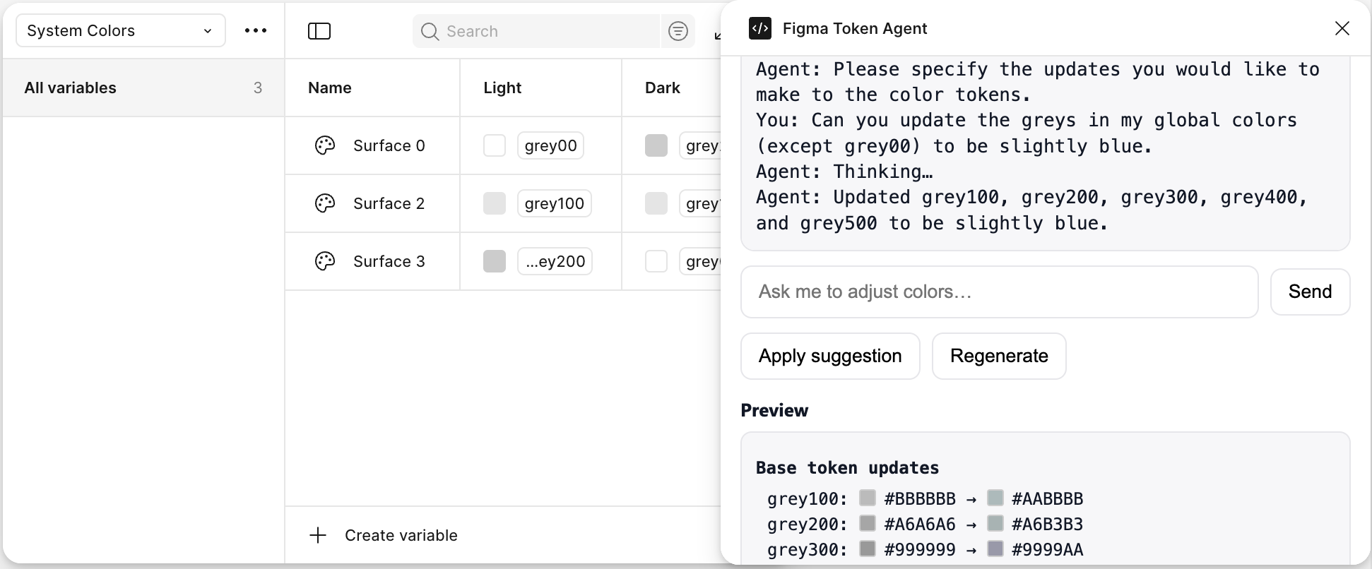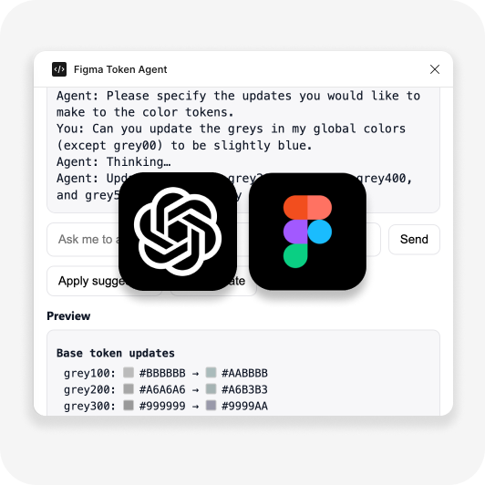Figma Token Agent is a Figma plugin powered by the ChatGPT API that lets designers update variables with simple natural language commands, removing the tedious and error-prone work of manual token edits. By automating dependency updates and proofing, it frees design system teams to focus less on repetitive maintenance and more on what matters—defining strategy, ensuring consistency, and aligning quickly with engineering.
